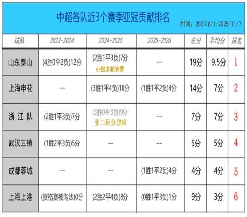 本赛季亚冠精英赛目前列东亚区倒数第一,是上海海港最近3个赛季的亚冠贡献真实缩影。不仅今年差,前2年同样如此。据统计,从2023年8月到2025年11月7日这3个亚冠赛季里,上港一共仅拿到9个积分,平均每个赛季仅3分,是所有参加亚冠的中超球队中最低,赛季平均贡献排名倒数第一。尴尬的是,这段时间2023赛季,2024赛季都是上港夺取中超冠军,即将结束的2025赛季也是十拿九稳,三冠王在即。