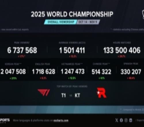 电竞体育11月10报道 昨日T1和KT的总决赛观众峰值达到了673w,而T1对阵BLG是694w。
