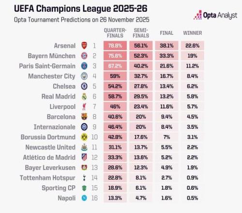 在欧冠联赛阶段前5轮战罢,Opta更新了超级计算机预测的欧冠夺冠概率,阿森纳22.6%领跑,拜仁19%位列第二,巴黎第三。