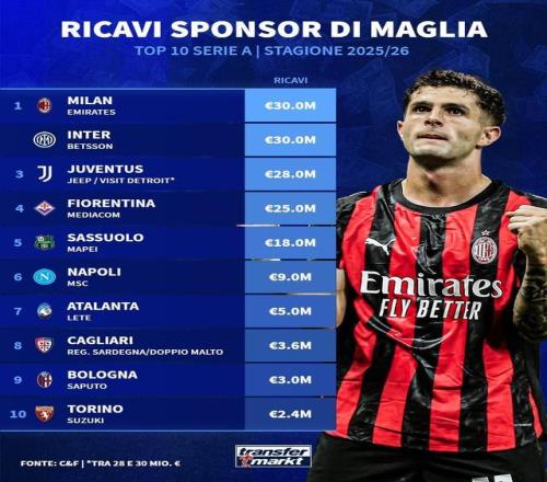 德转统计本赛季意甲俱乐部球衣胸前广告年赞助费TOP10: