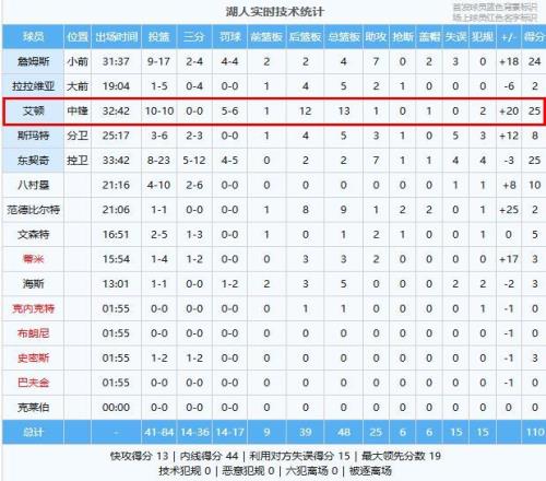艾顿25分13板1助、东契奇25分2板7助、詹姆斯24分4板7助2帽、八村塁10分、斯玛特8分5板3助、文森特5分1板2助、海斯3分5板、蒂米3分3板2助、史密斯3分