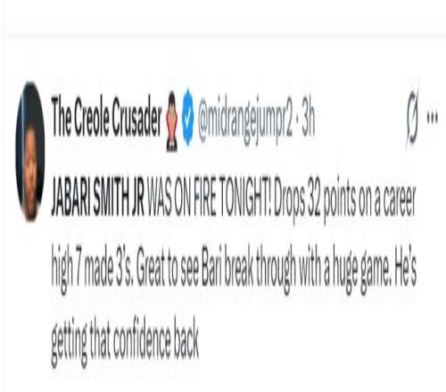 这场比赛小贾巴里-史密斯是全队最高光的一个,他在末节命中第二个三分球时怒吼释放,这场比赛对他来说算是扫去阴霾的一战,因为上一场小贾12中3,对阵雷霆一战15中3,小贾进入1月后状态下滑非常严重。