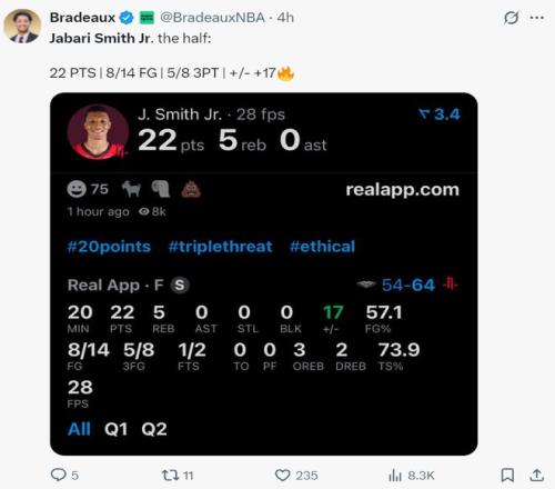 全场比赛小贾巴里-史密斯41分钟,21中11,三分13中7,罚球4中3,拿到32分8篮板1盖帽,命中率52.4%,三分命中率53.8%,正负值+21。