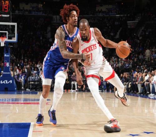 节末伊森和乌布雷对轰三分,第一节火箭34-32领先。进入第二节,恩比德继续造犯规+吃饼,杜兰特单打稳定局面,恩比德靠着阿门造三分犯规,场边乌度卡非常愤怒。双方比分交替上升,后半段阿门和申京强攻篮下,恩比德又开始造杀伤,配合马克西单打+乌布雷三分球,76人打出小高潮,半场68-61领先火箭。进入第三节,杜兰特连续飙中三分,马克西内突外投,恩比德顶翻申京,乌度卡忍无可忍冲着裁判抱怨,吃到技犯!后半段杜兰特轰三分球,申京打成1+2,小贾继续炸扣,但乌布雷和恩比德守住领先。