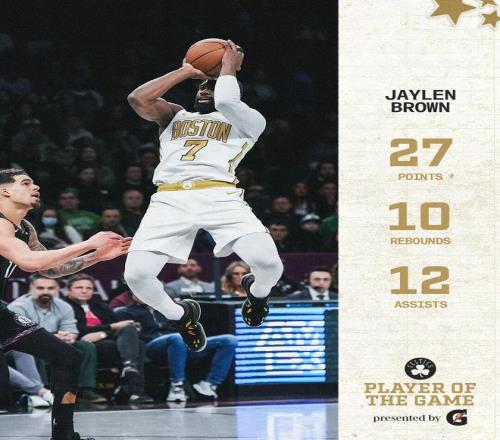 这场凯尔特人赢得是真不容易,双加时大战才艰难战胜对手,当家球星布朗全场交出27分10篮板12助攻,这也是布朗生涯的第五次三双。